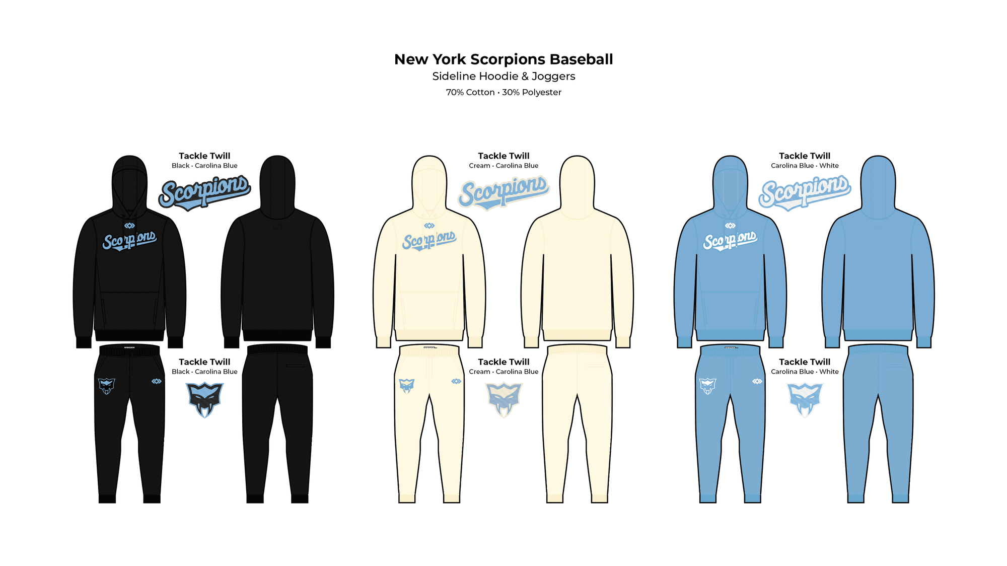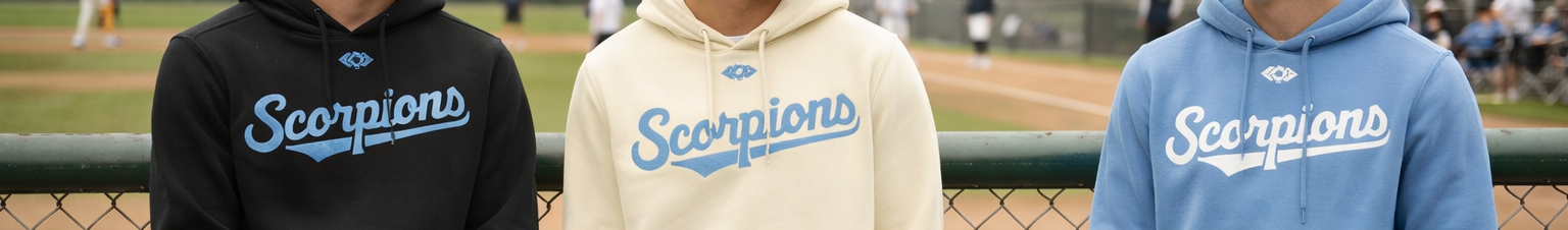 Hoodies $65/each and Joggers $55/each or save $10 and order the set for $110/set. These hoodies and joggers are quality cotton and polyester, not sublimated like the products in the team store. The Scorpions name will be embroidered tackle twill which is raised off the fabric.